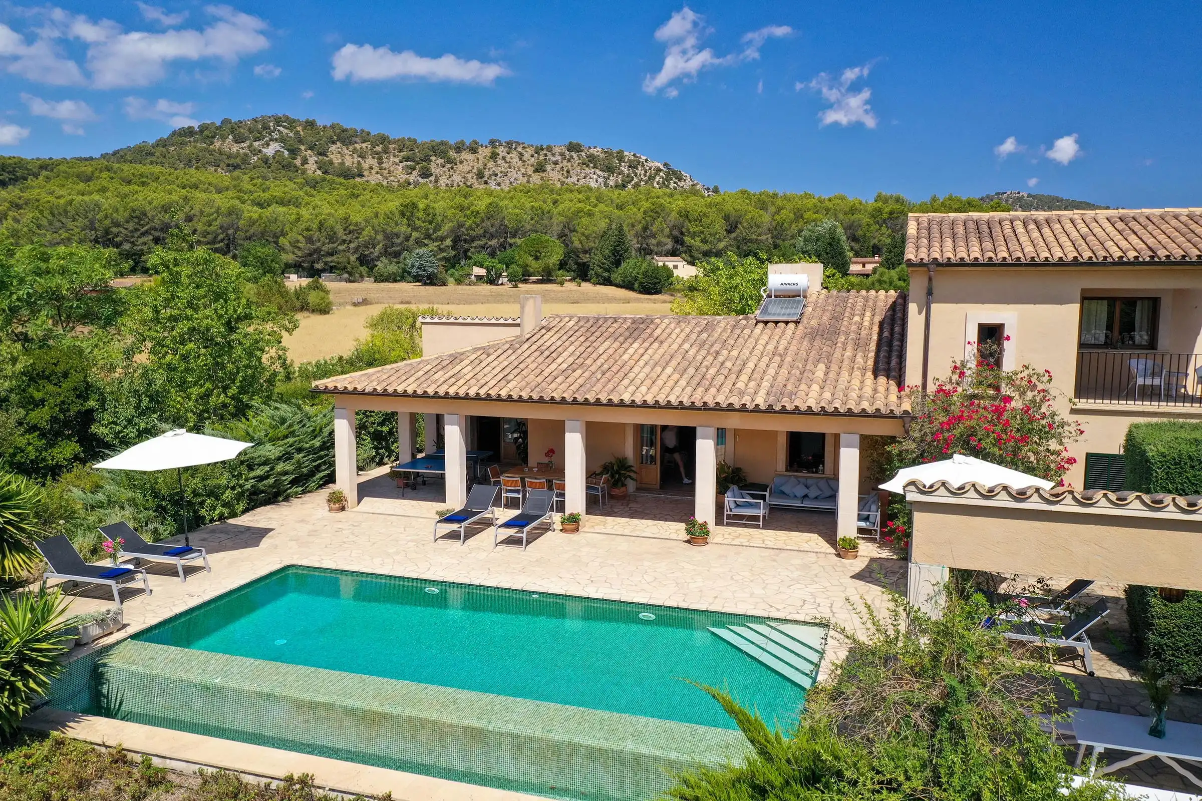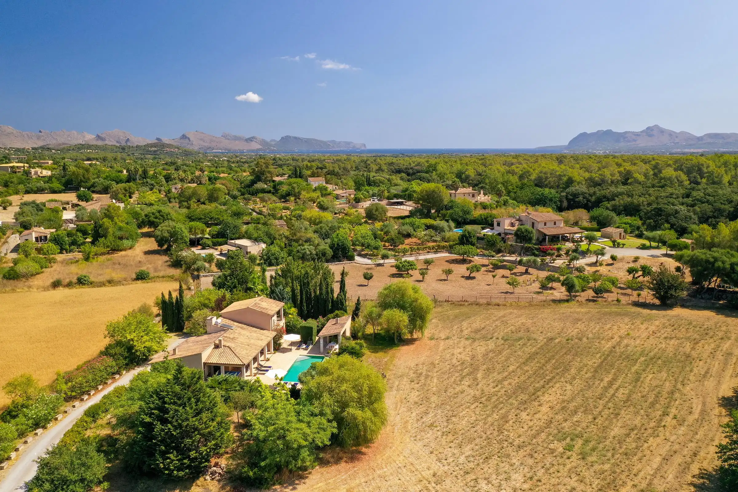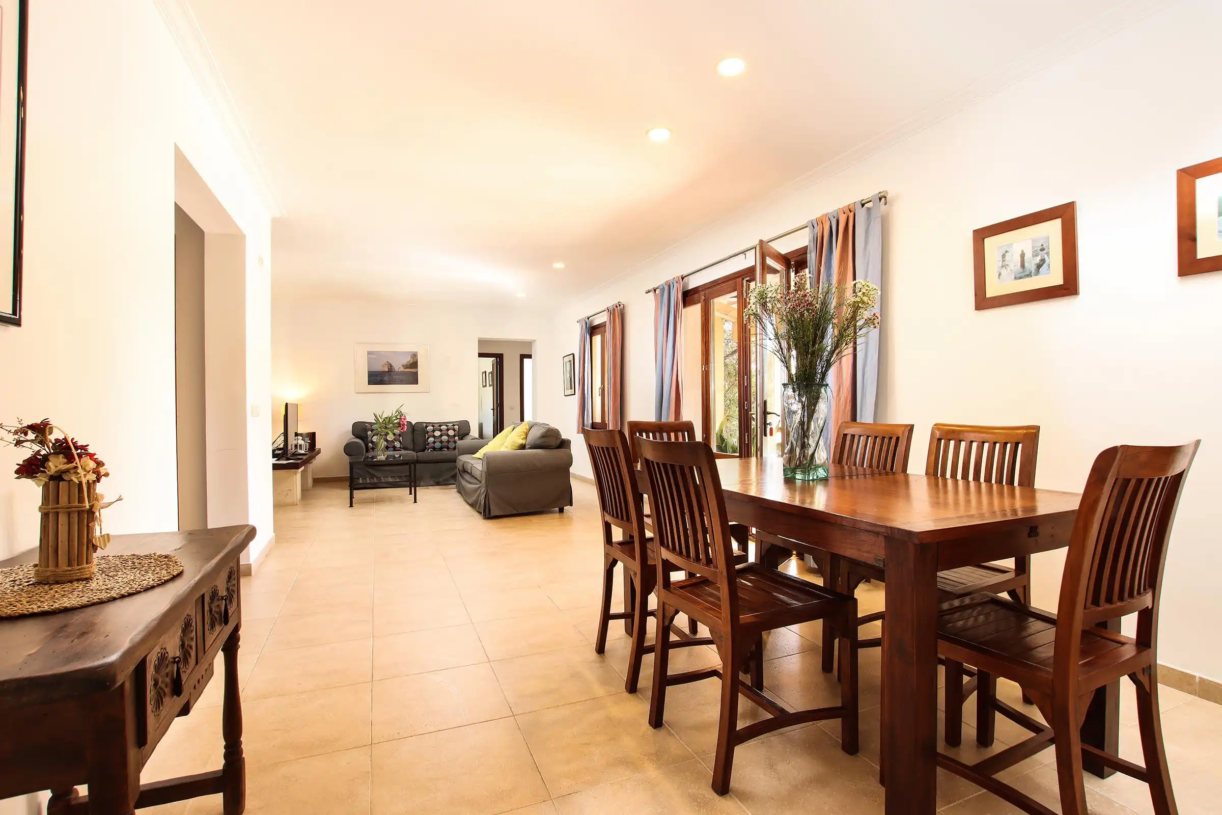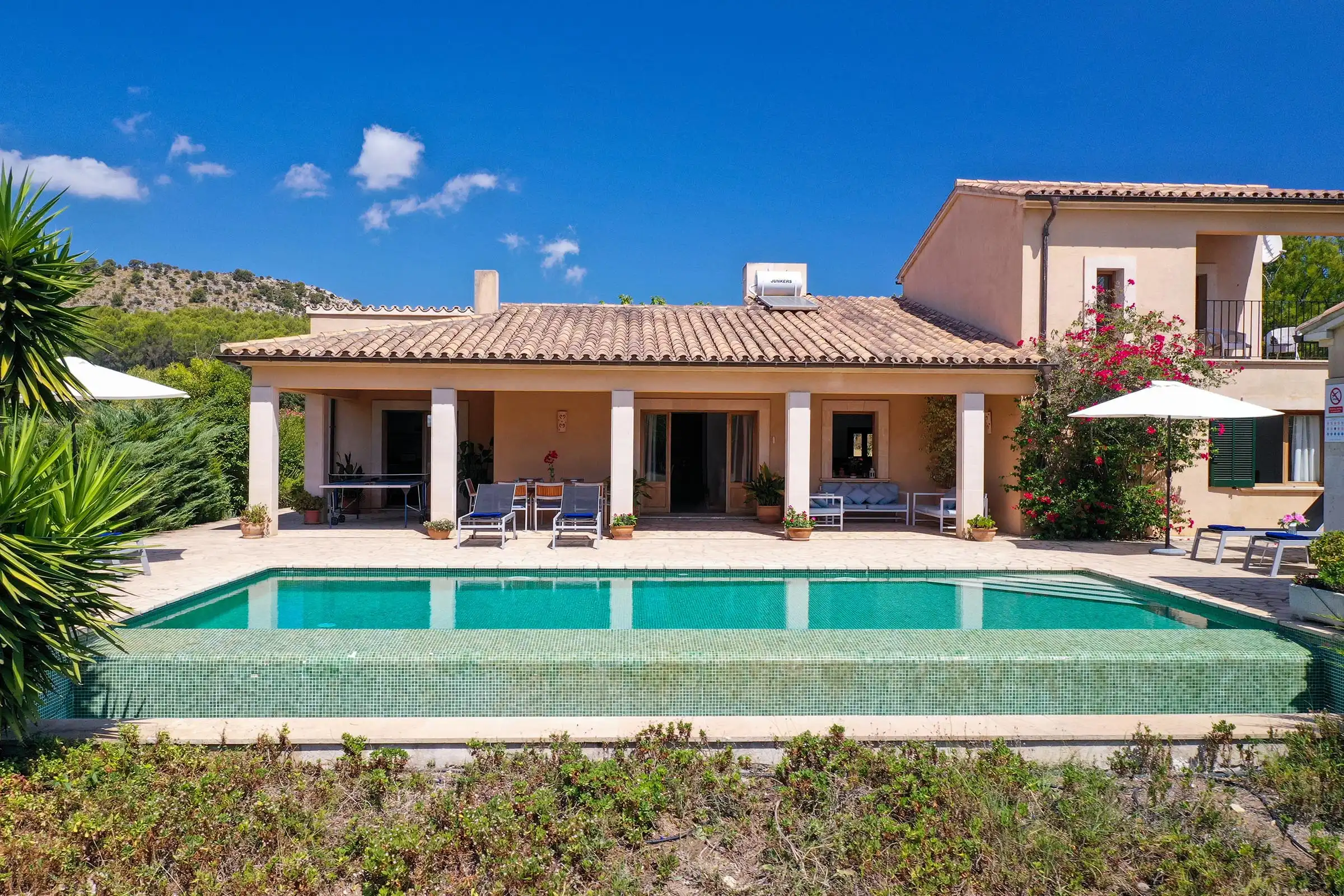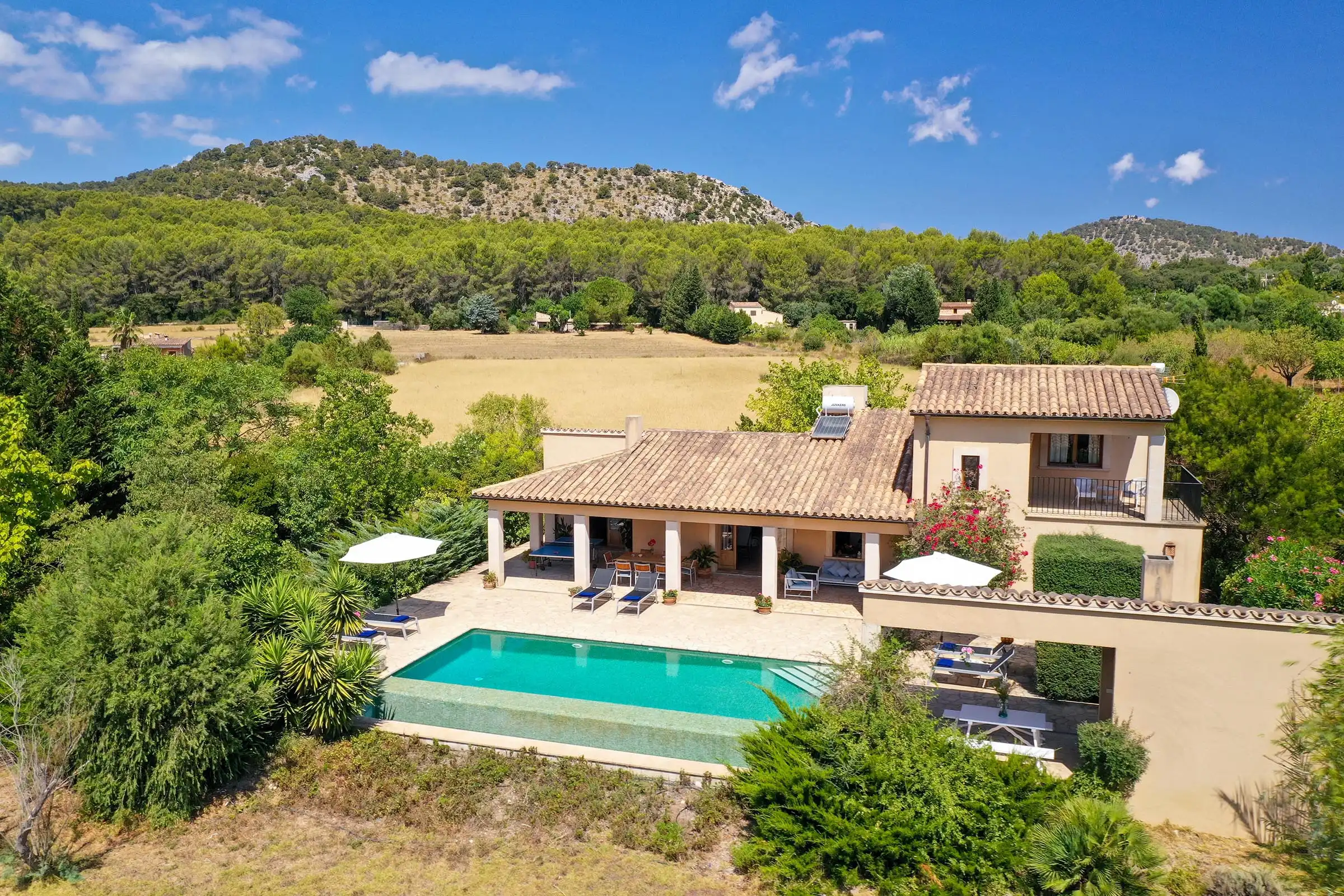 Set at one end of a tranquil valley, dominated by the hill of Puig de Maria in a much sought-after area close to Pollensas verdant golf course; Can Mares has a peaceful countryside and lovely views over the hills, fruit orchards, and olive groves. The villa was is modern in design, comfortably furnished to a high standard, whilst retaining elements in the decoration and construction that reflect the rural surroundings.
