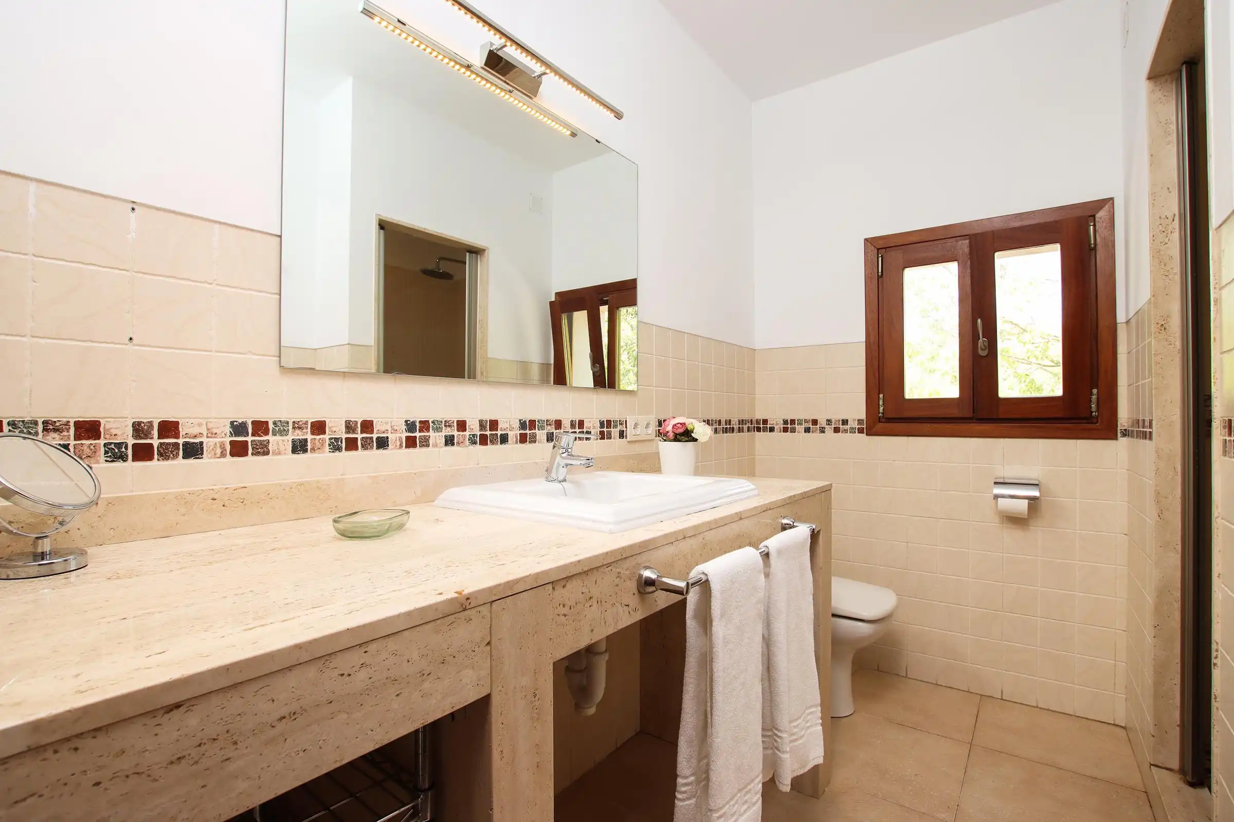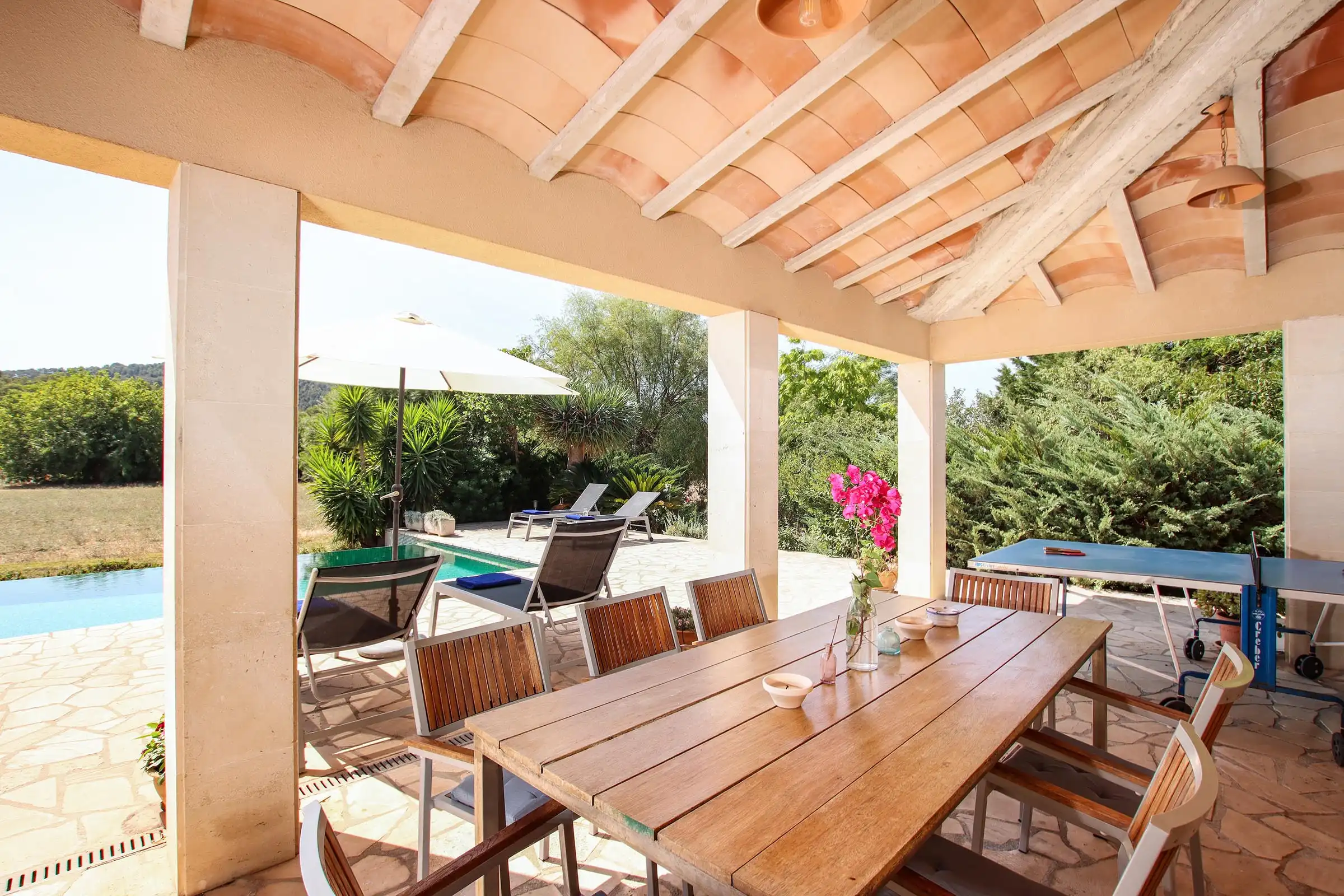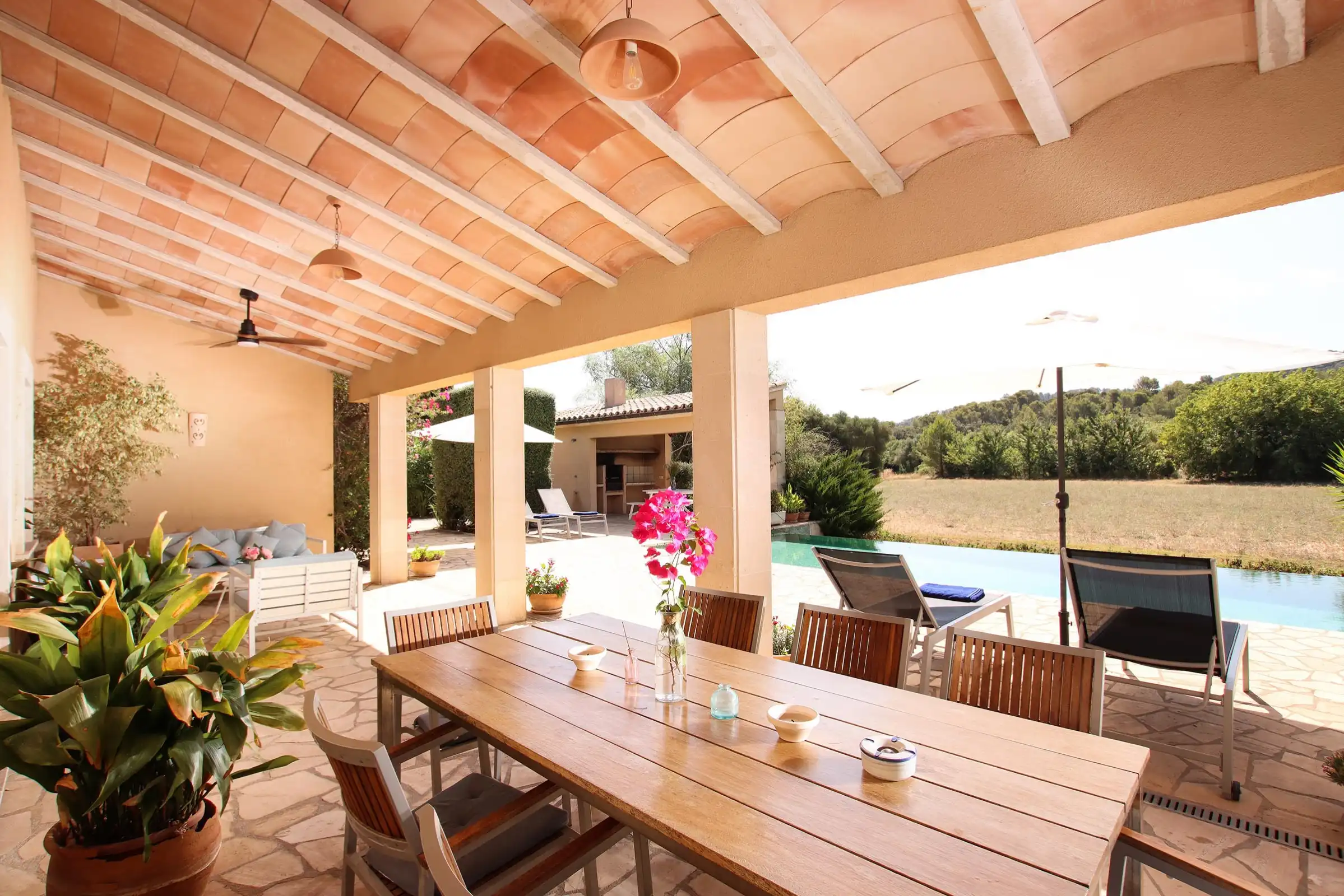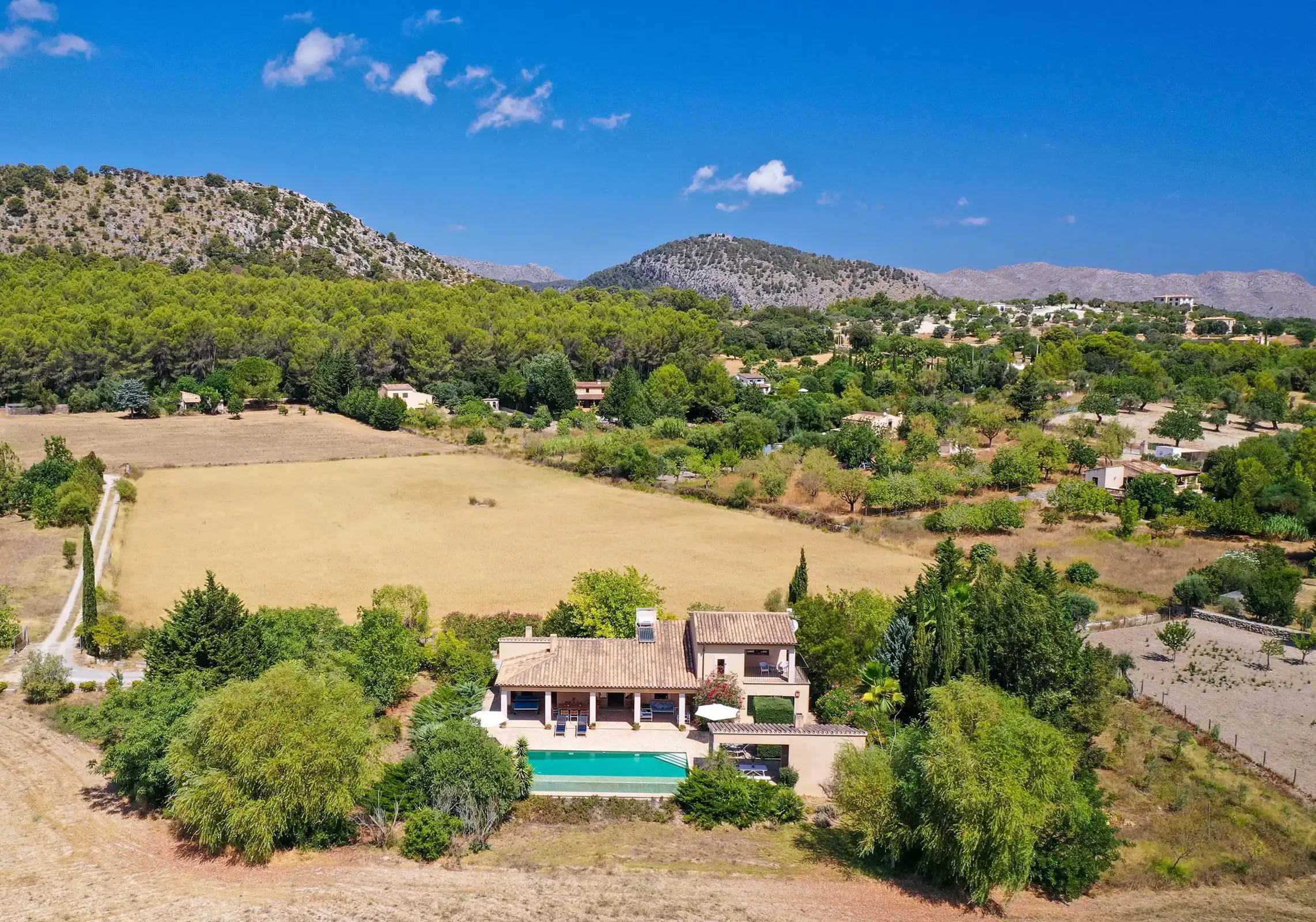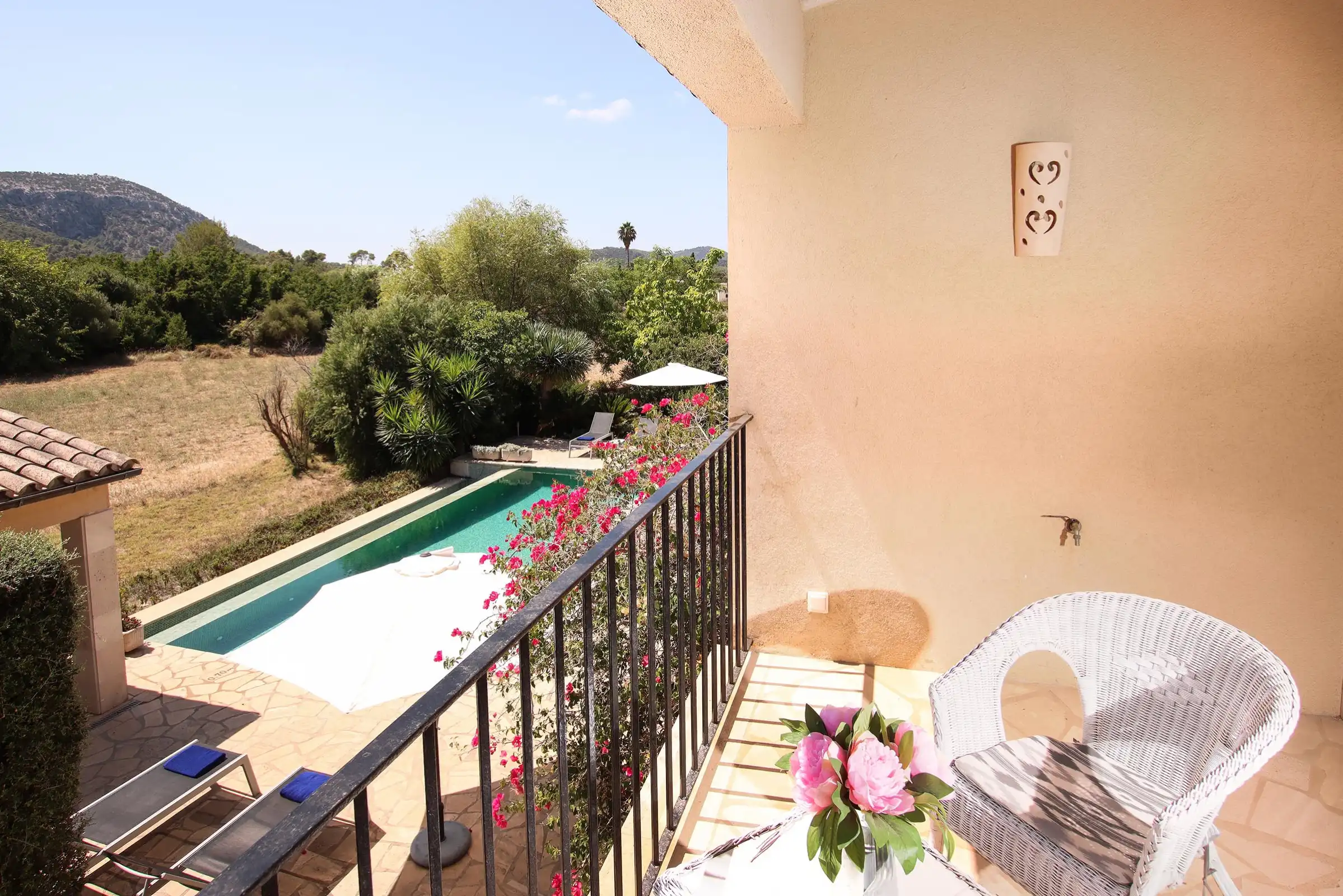 Set at one end of a tranquil valley, dominated by the hill of Puig de Maria in a much sought-after area close to Pollensas verdant golf course; Can Mares has a peaceful countryside and lovely views over the hills, fruit orchards, and olive groves. The villa was is modern in design, comfortably furnished to a high standard, whilst retaining elements in the decoration and construction that reflect the rural surroundings.
