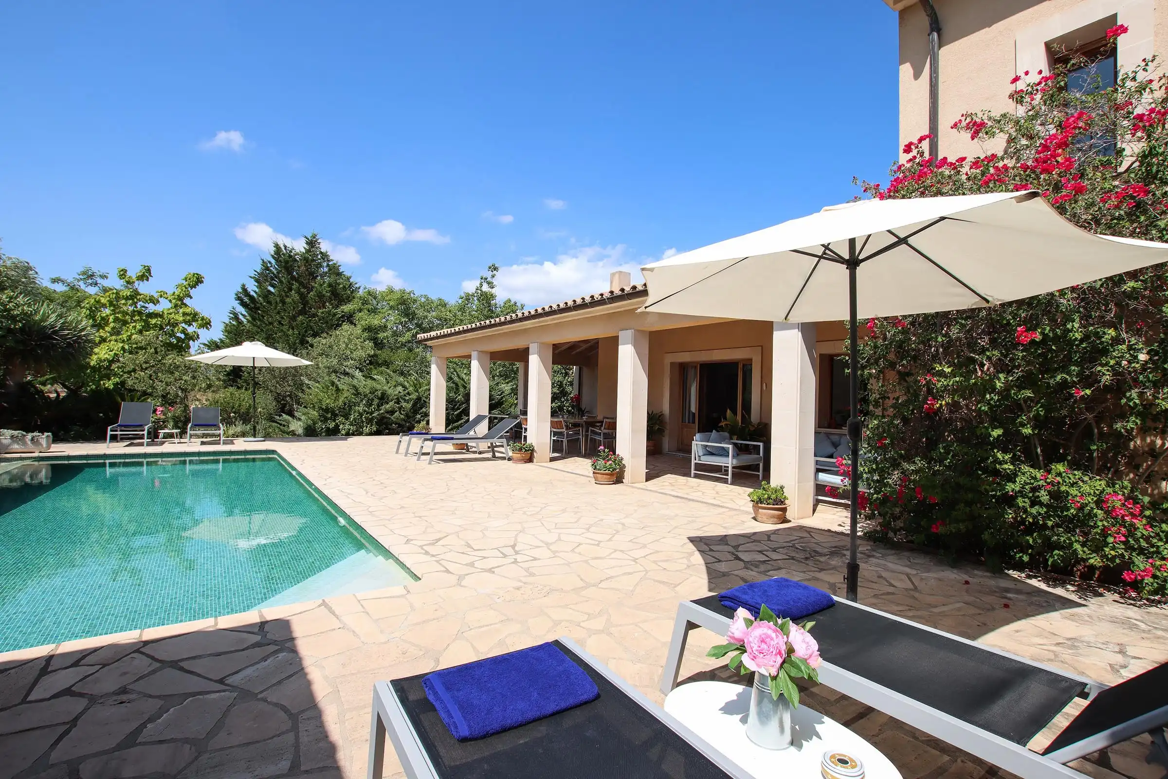 The spacious entrance with solid, wooden double doors blends harmoniously with the large sandstone block work of the walls. Arranged on two levels, a magnificent master suite with a huge corner terrace monopolizes the first floor. The jewel in the crown of Mares' charms has to be its wide, shaded pool side terrace and its iridescent green tiled free- flow swimming pool.