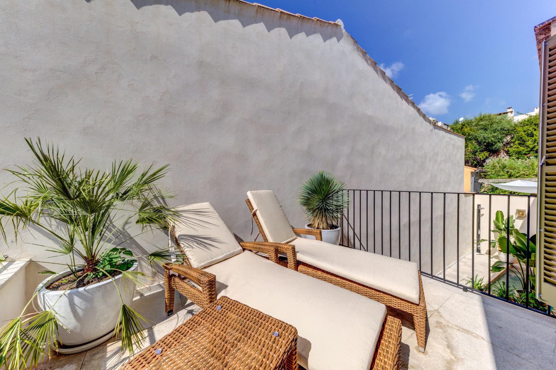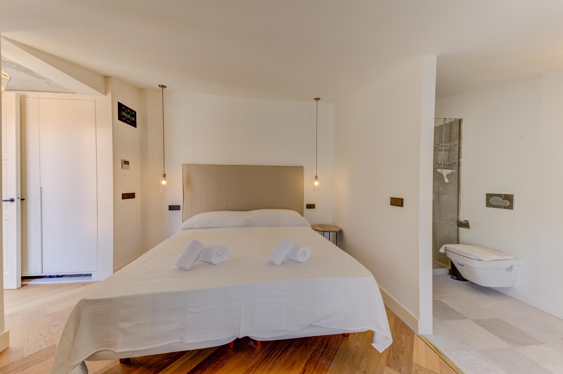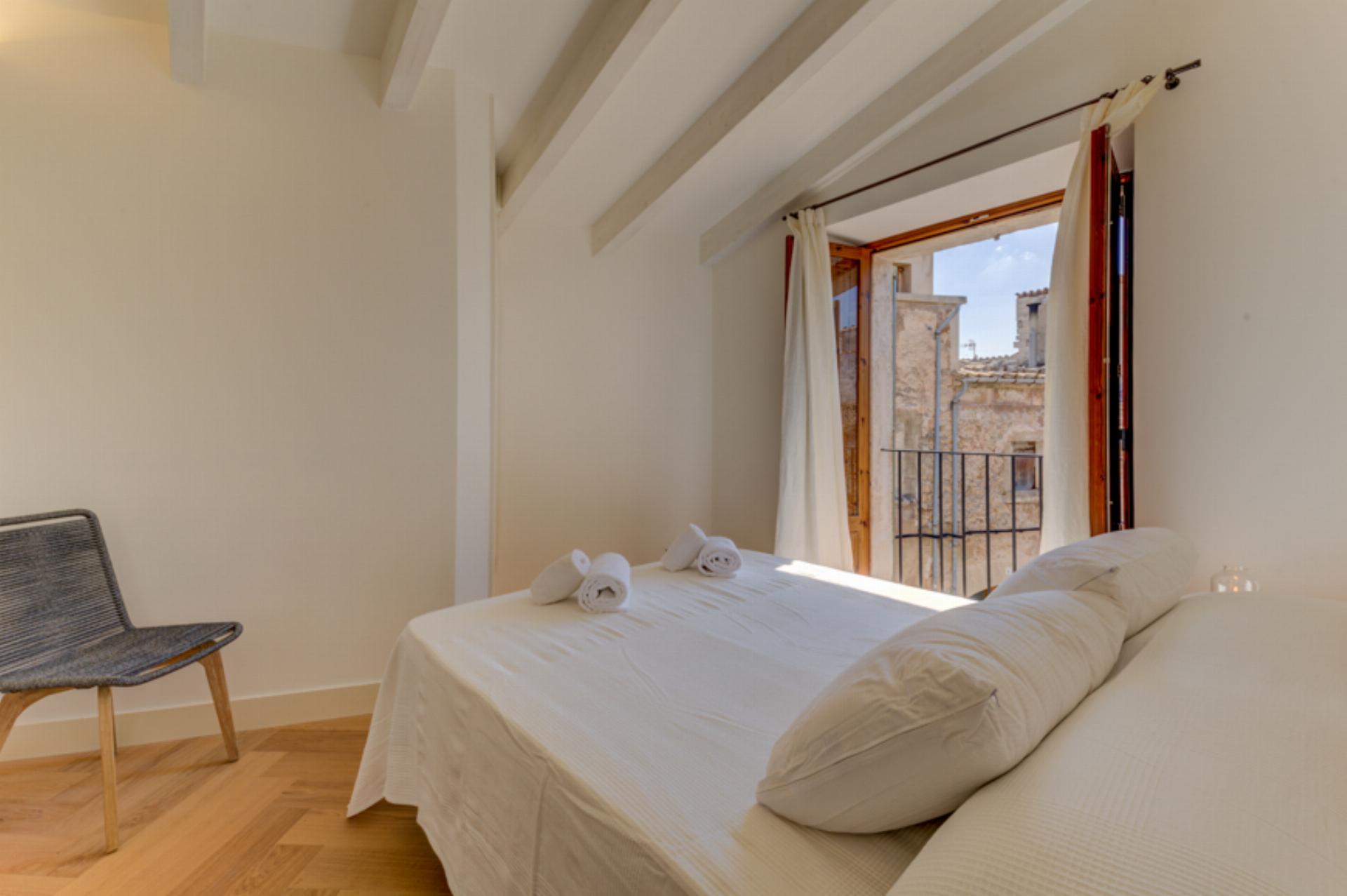The master bedroom suite occupies the top floor, enjoying delightful views across the rooftops of Pollensa. This elegant space features its own shower room and a private terrace furnished with a table and chairs—perfect for enjoying a morning coffee or evening drink.