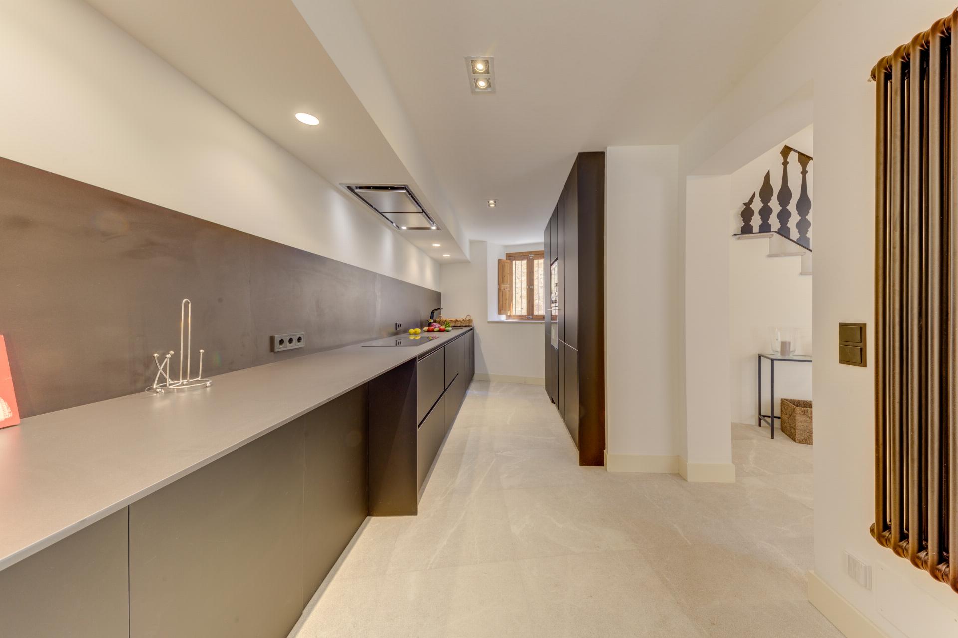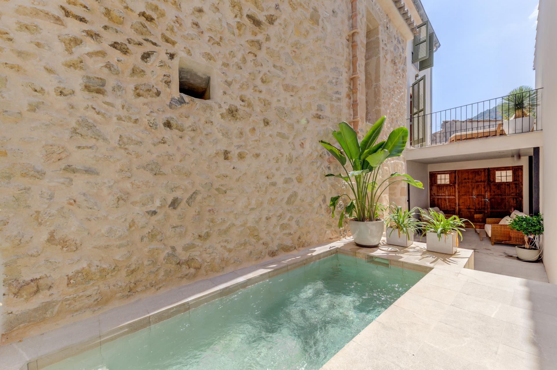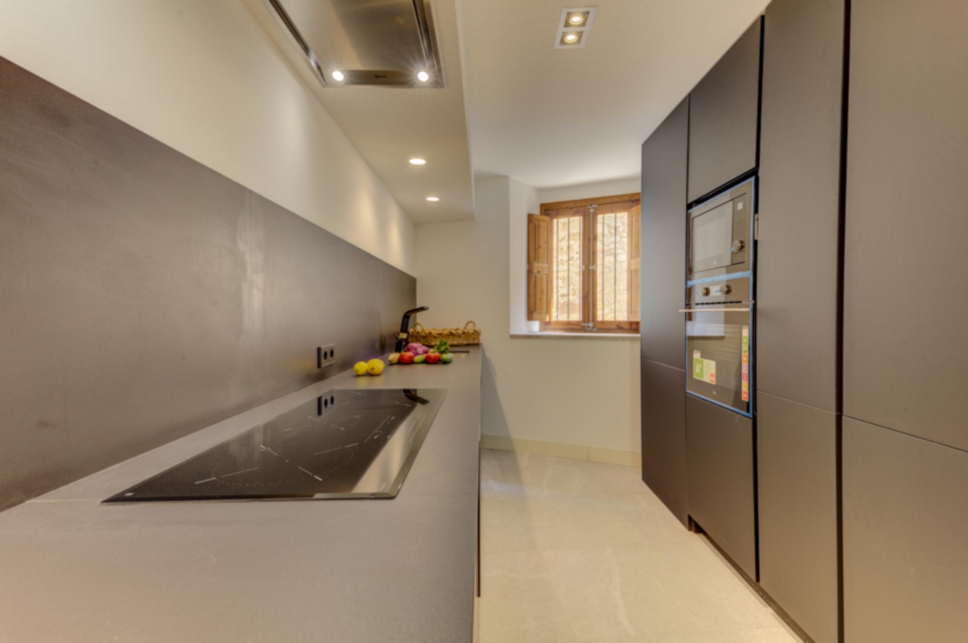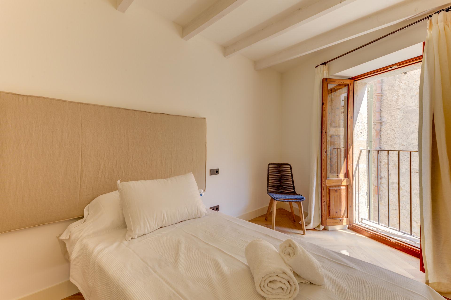 The master bedroom suite occupies the top floor, enjoying delightful views across the rooftops of Pollensa. This elegant space features its own shower room and a private terrace furnished with a table and chairs—perfect for enjoying a morning coffee or evening drink.