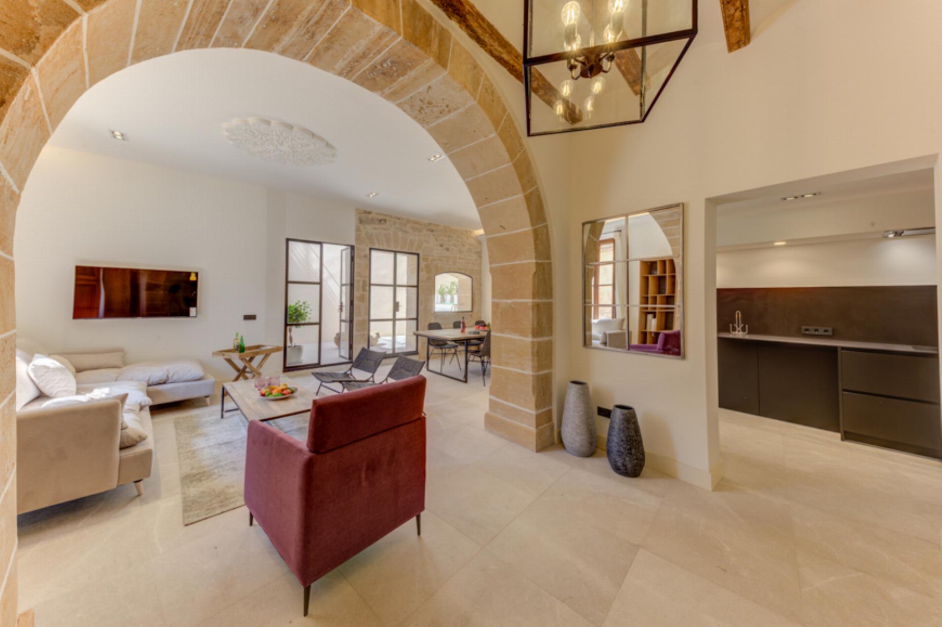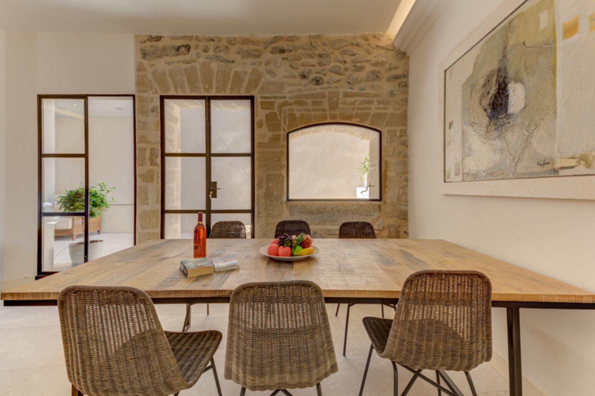 Casa Inès is arranged over several levels, all connected by an internal staircase. On the ground floor, guests are welcomed into a bright and inviting lounge featuring Wi-Fi, satellite TV, comfortable sofas and armchairs, and attractive exposed stone details that reflect the building’s heritage. The fully equipped kitchen has been custom-designed for Casa Inès and sits alongside the living space. This level also includes a guest WC and direct access to an outdoor sitting area furnished with rattan sofas and a private plunge pool for cooling off, an exceptional feature for a townhouse in such a central location.