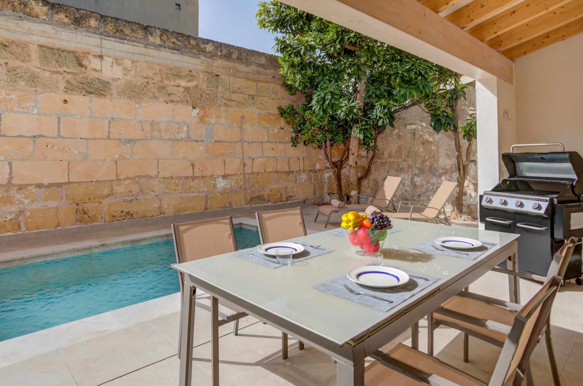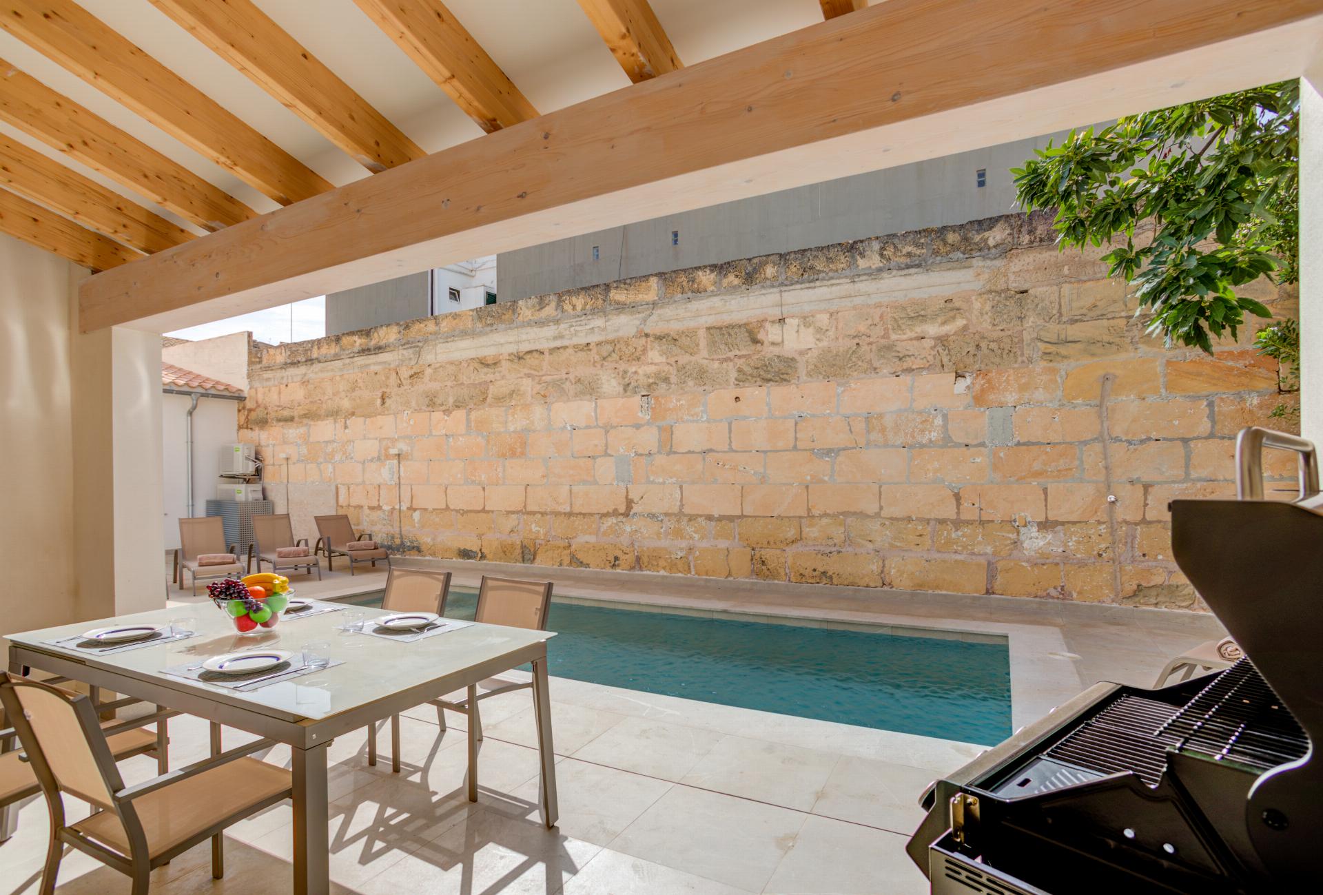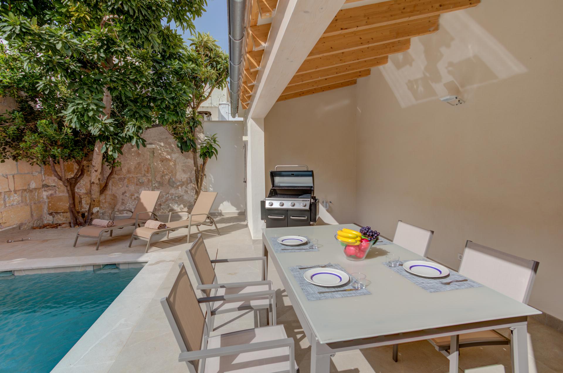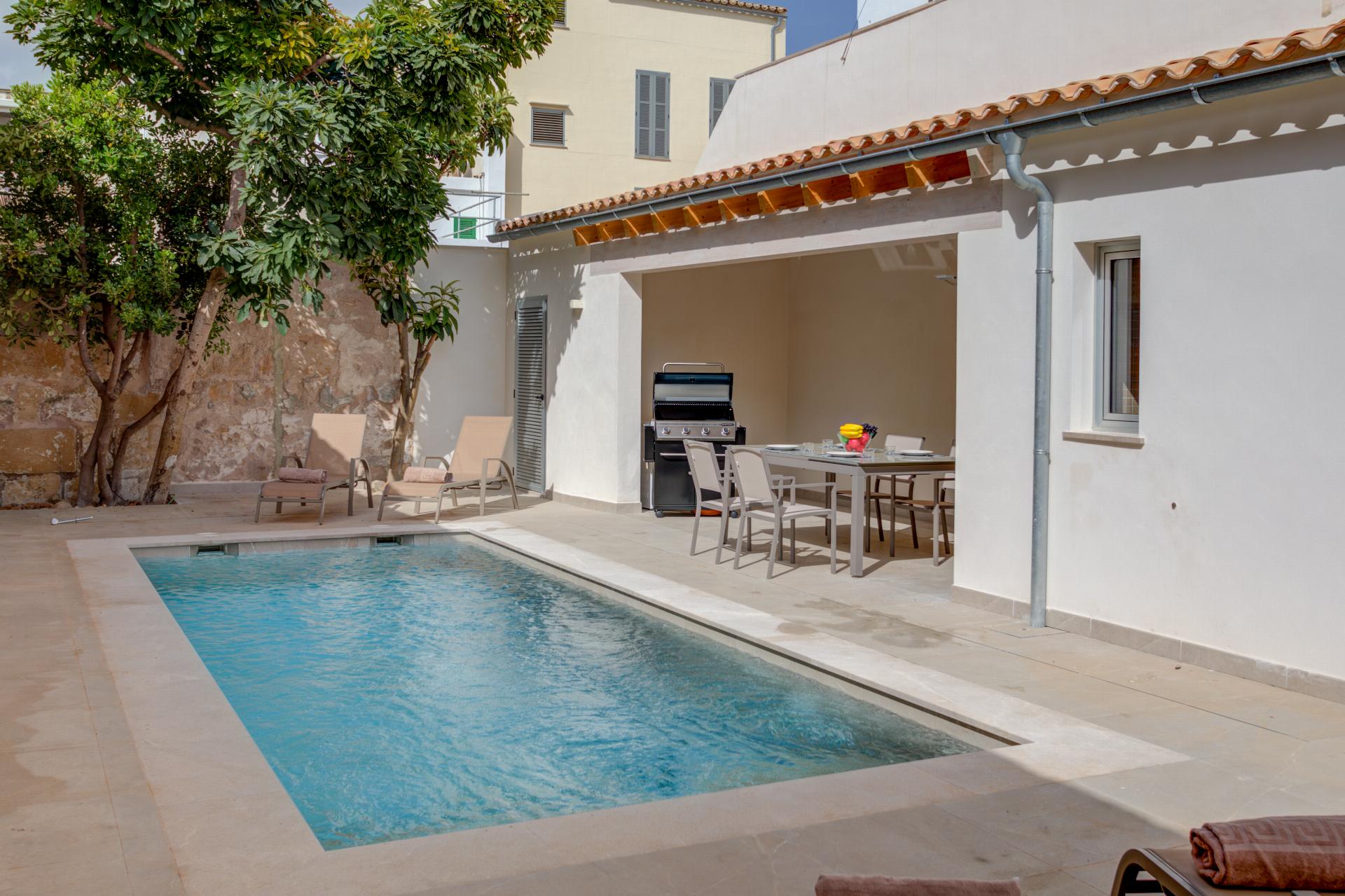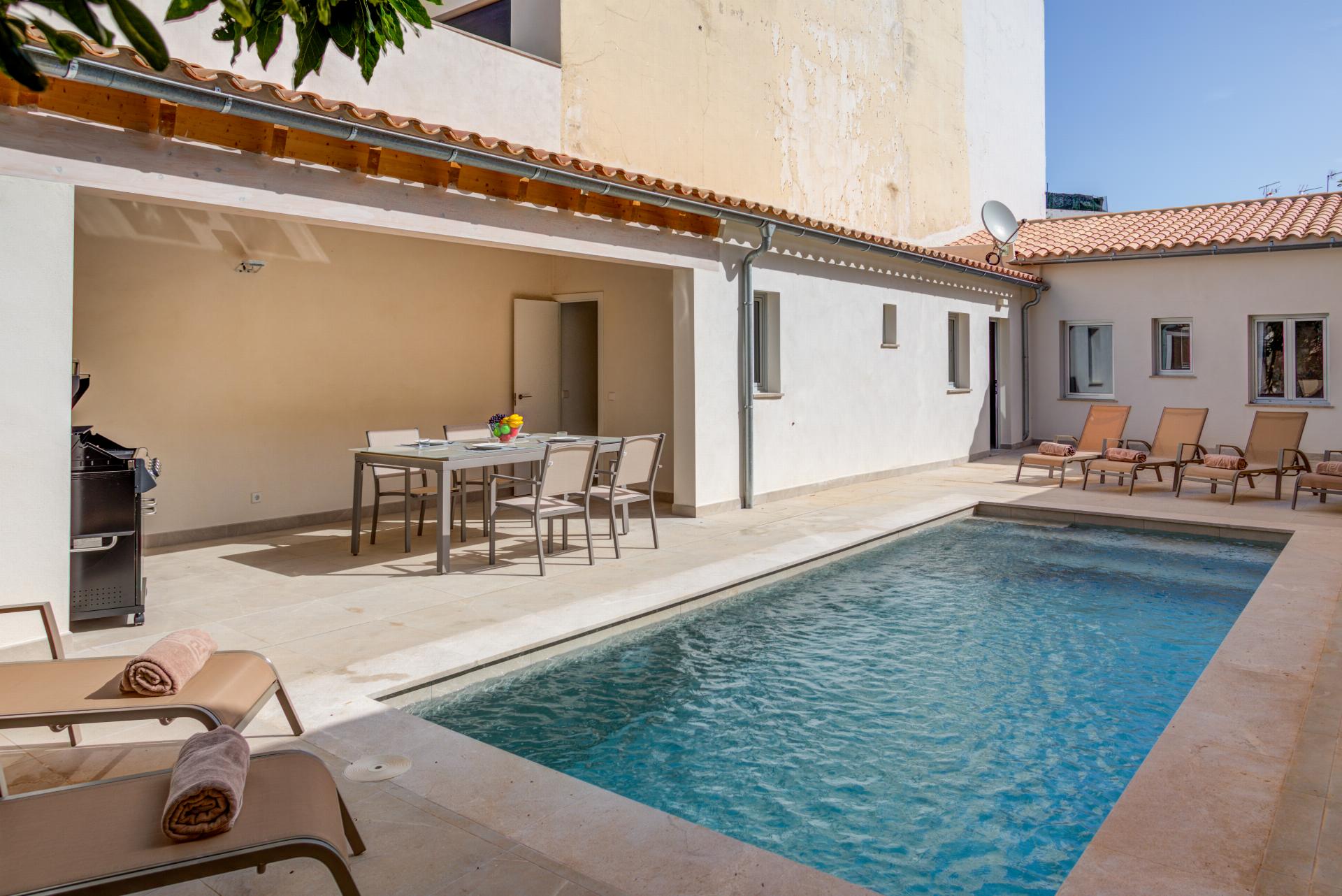 An unusually large private pool is the star, set beside a sunbathing terrace with loungers. An open, shaded veranda offers alfresco dining and a barbecue—perfect for slow lunches between beach swims and evening strolls along the Pine Walk.