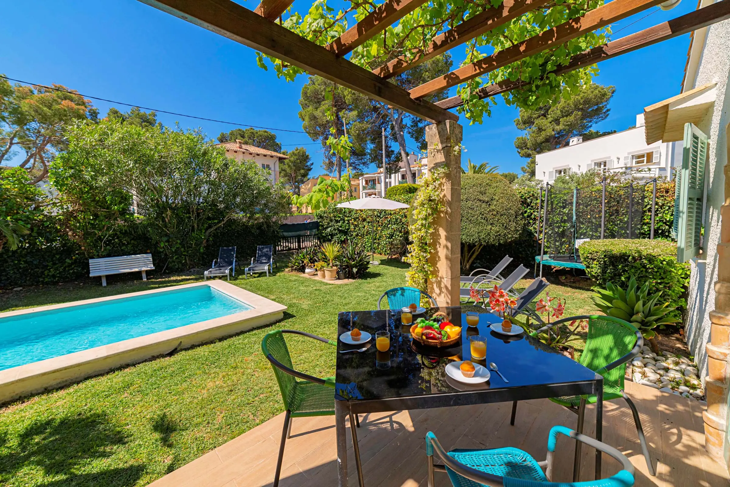 The outdoor area is one of the highlights of Casa Pinaret. The private swimming pool, surrounded by sun loungers and a pleasant terrace, creates a relaxing environment for cooling off, sunbathing and enjoying long lazy afternoons in the Mallorcan sunshine. A shaded dining area and barbecue give guests the perfect setting for al-fresco meals and evenings outdoors. The enclosed garden is ideal for families with children and provides an added sense of privacy and tranquillity.