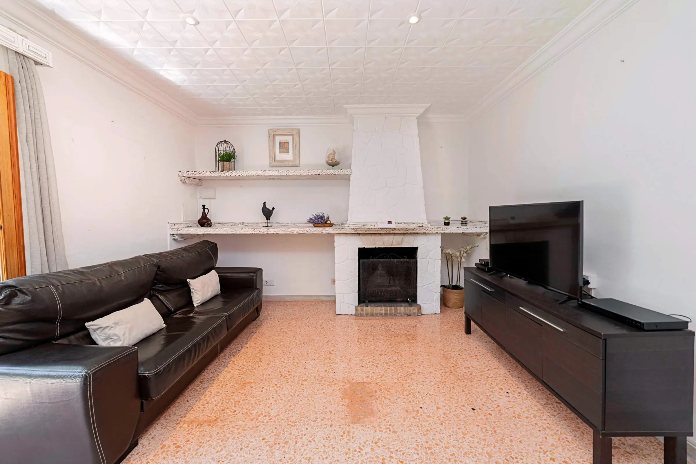Inside, the villa features a bright and comfortable living room with dedicated dining space, creating a homely atmosphere for relaxing after days at the beach or exploring the island. The fully equipped kitchen provides everything needed for a self-catering stay, including modern appliances and a separate laundry area. Casa Pinaret sleeps up to five guests across three bedrooms: a double room with en-suite bathroom, a twin room and a single room. A separate family shower room serves the additional bedrooms, making the layout practical and convenient for families or friends sharing. All accommodation is set on one level, making the villa particularly suitable for guests seeking step-free living. Air conditioning is available in the bedrooms during scheduled hours.
