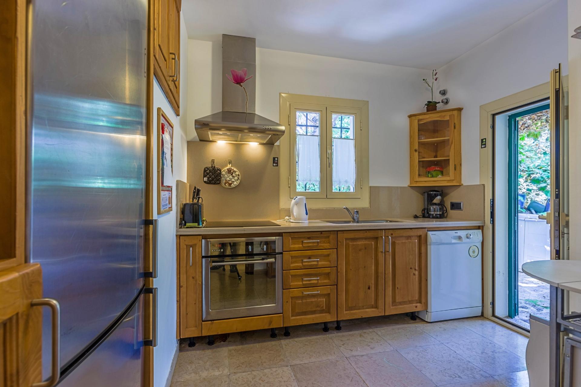 The fully equipped, separate kitchen offers everything needed for a comfortable stay and has direct access to a wonderful covered terrace (pergola), which leads via steps to the barbecue and pool area, perfect for relaxed outdoor living.