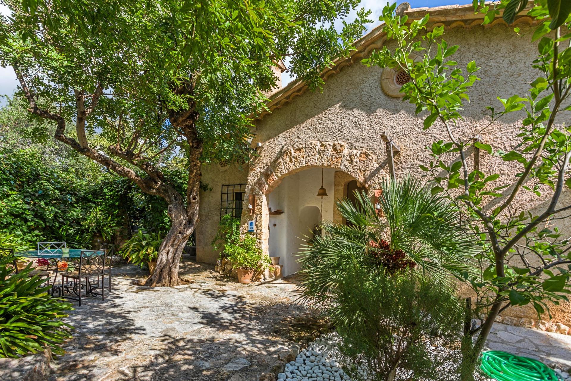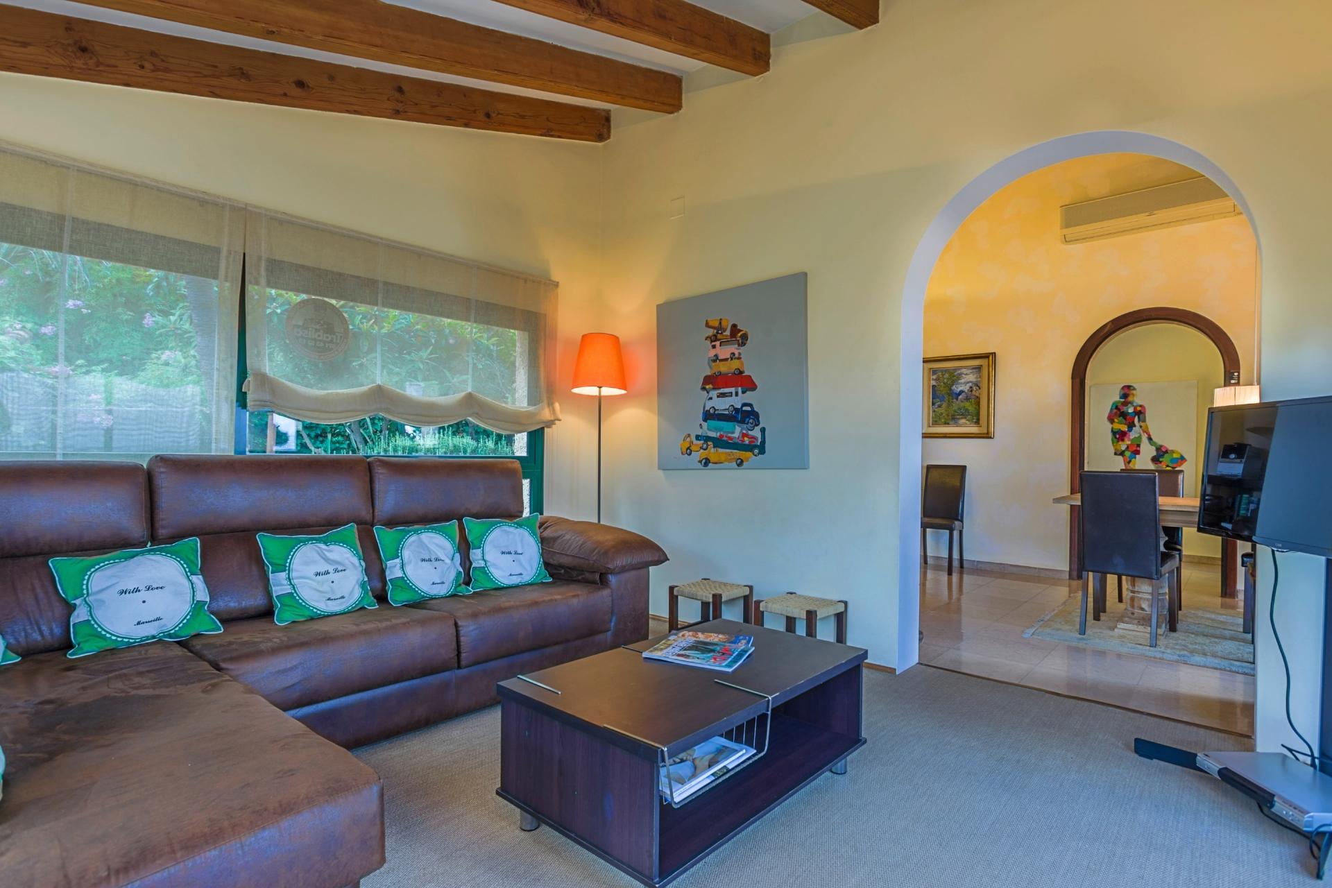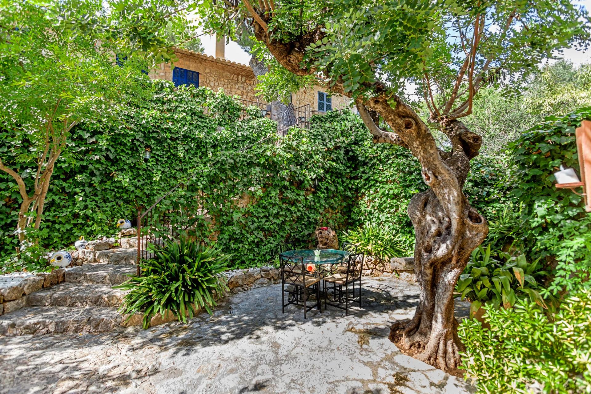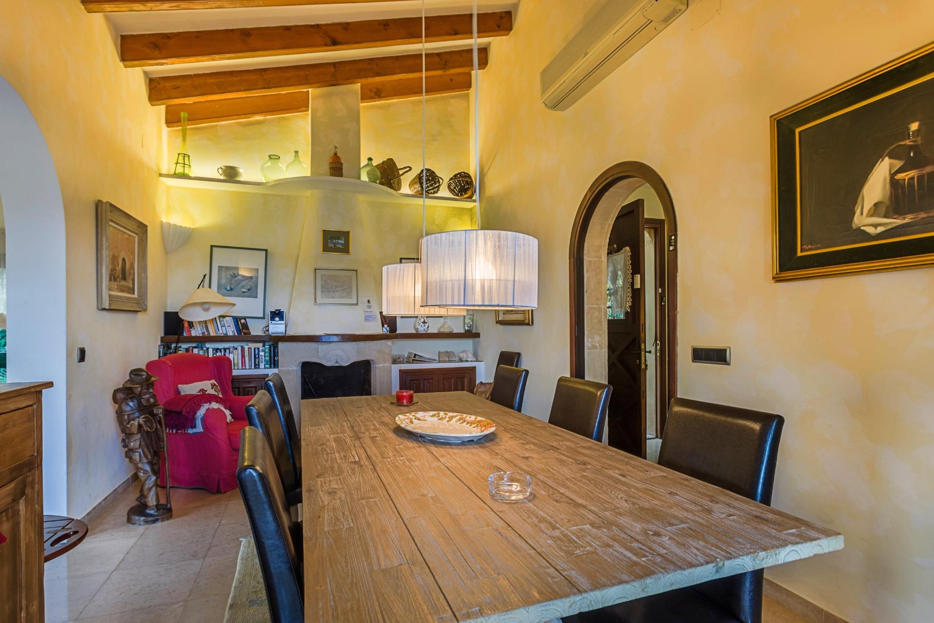 From the entrance gate, stone steps lead down to a welcoming courtyard with a delightful seating area and garden. The front door opens into a beautifully decorated dining room, where large French windows flood the space with natural light and open directly onto the terrace. An elegant archway connects the dining room to a bright and airy lounge, with large windows framing lovely views across Pollensa.