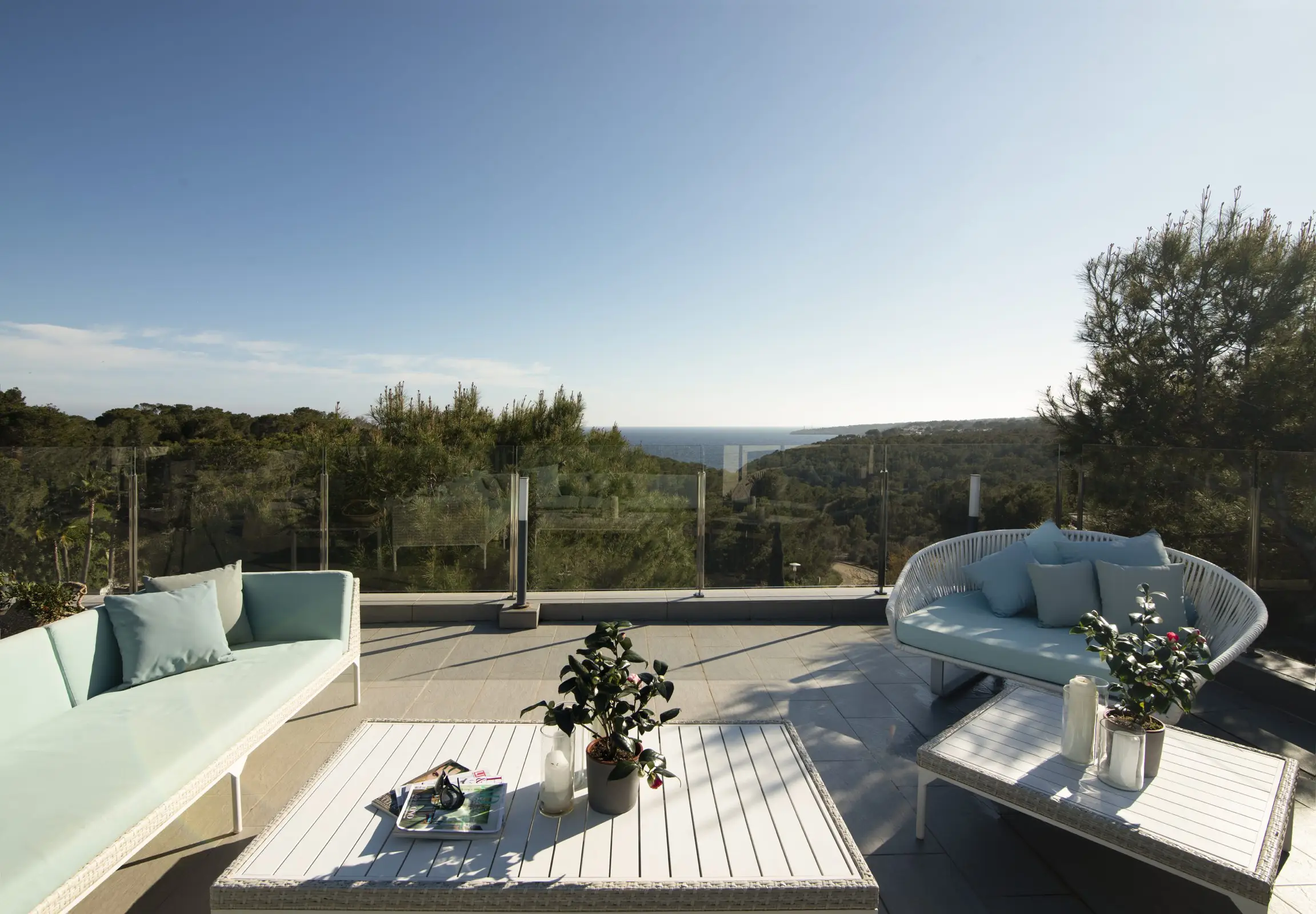 Villa Cala Vinas has a living area of 320m2 and a plot of 1.600m2 and is located in the quiet neighbourhood of Calvia, the beach can be reached by foot. Palma City and the airport are reached in 20 minutes by car. The property comprises two floors: Ground floor: living area and kitchen offering access to the terraces, two bedrooms with en-suite bathroom and a separate entrance. First floor: master bedroom and additional bedroom both with bathrooms en suite, wardrobe and access to the terrace. The same floor also leads to a rooftop terrace with bar and stunning views to the sea, garden and surrounding. This property is perfect for those who want to enjoy a wonderful vacation in Mallorca, due to its location close to the beach. Extras: Swimming-Pool, garage