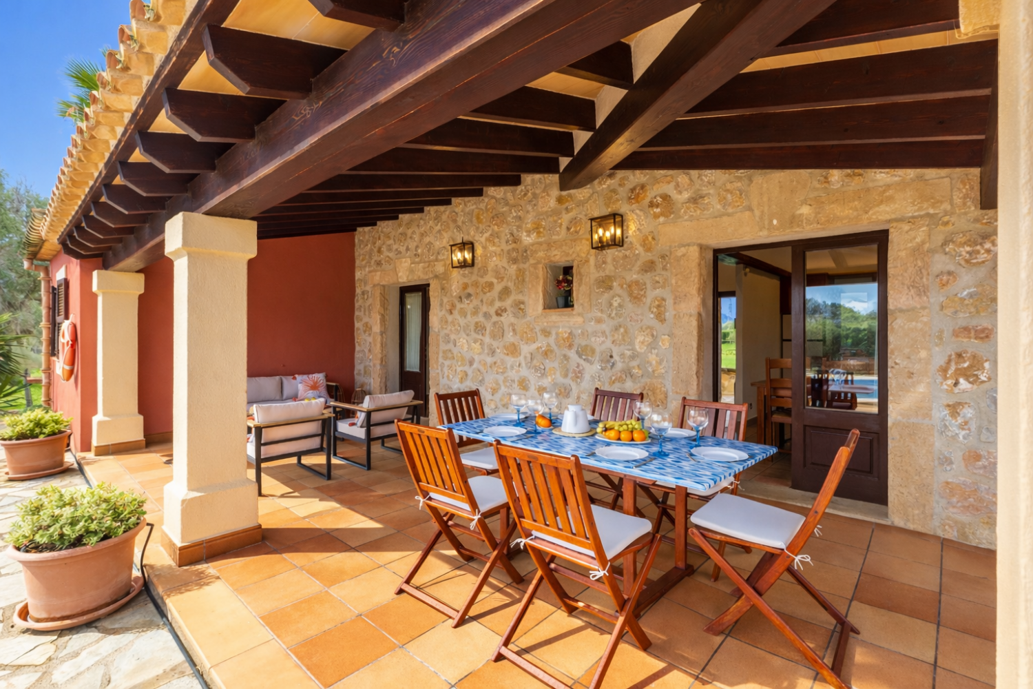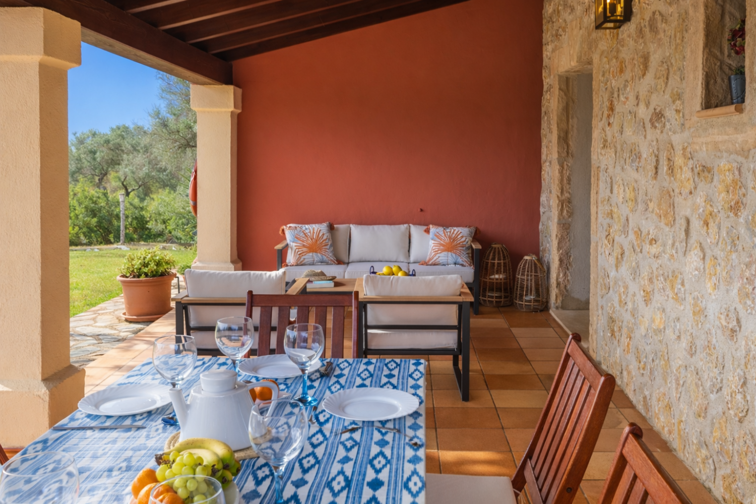 - Shaded terrace with outdoor sofas and dining area