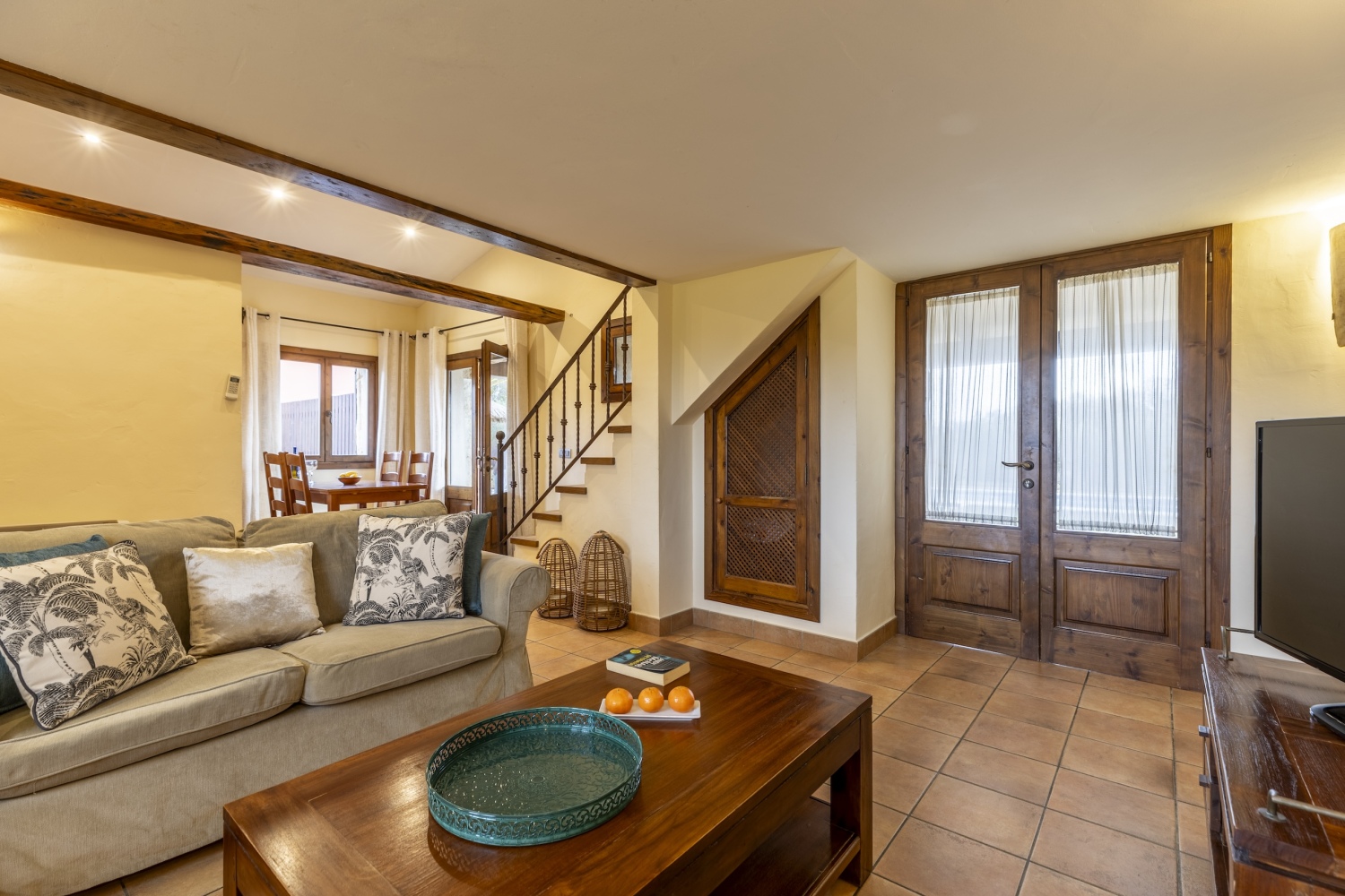 - Bright and comfortable living room with large sofas, Smart TV with Netflix, and direct access to the terrace