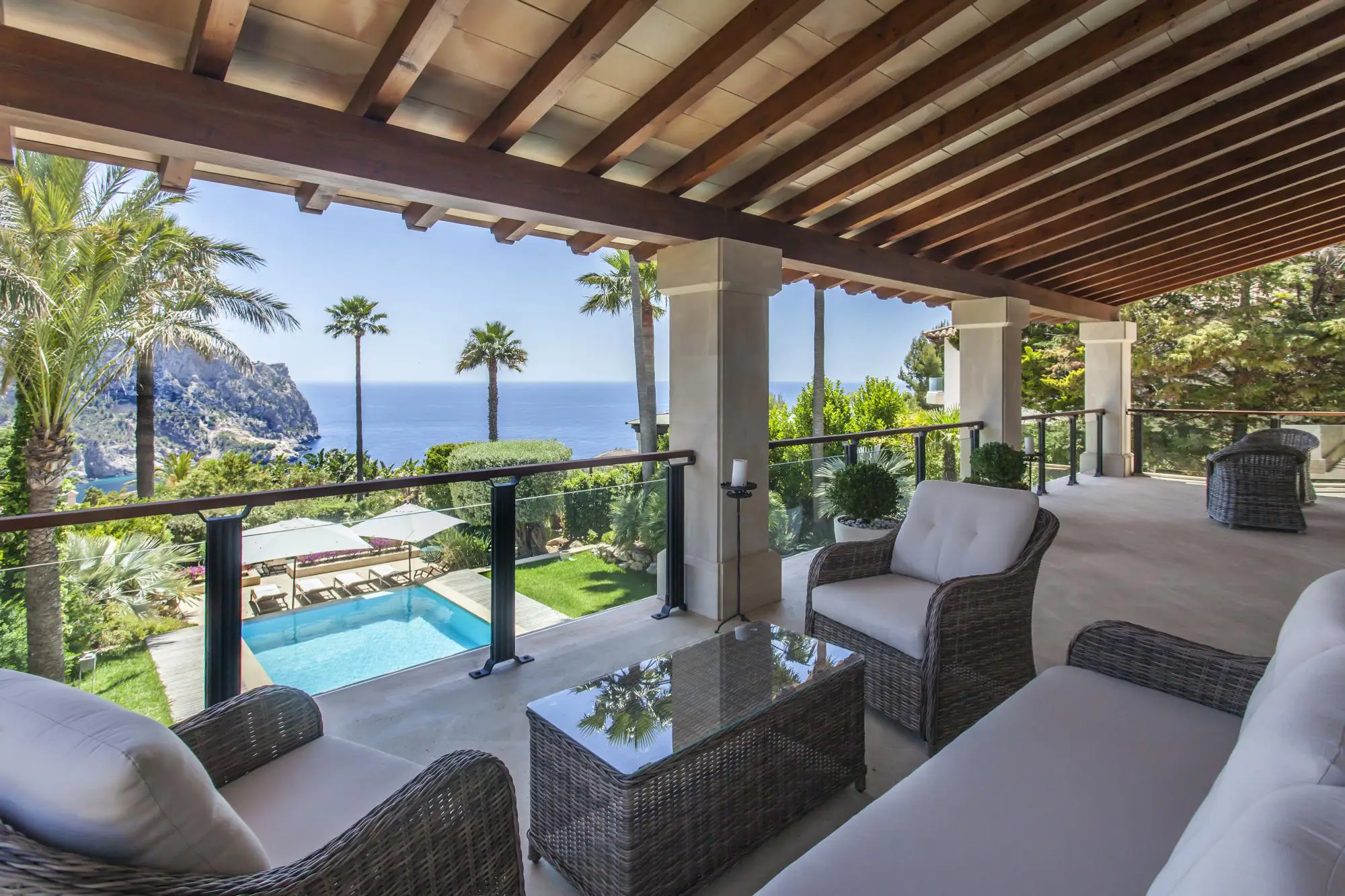 The outdoor areas of Villa Laroc are designed for stylish relaxation. The 10 × 5 metre pool with water feature is surrounded by elegant terraces and lush Mediterranean gardens, all framing panoramic views towards the sea.