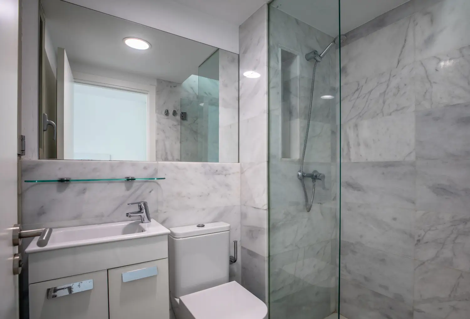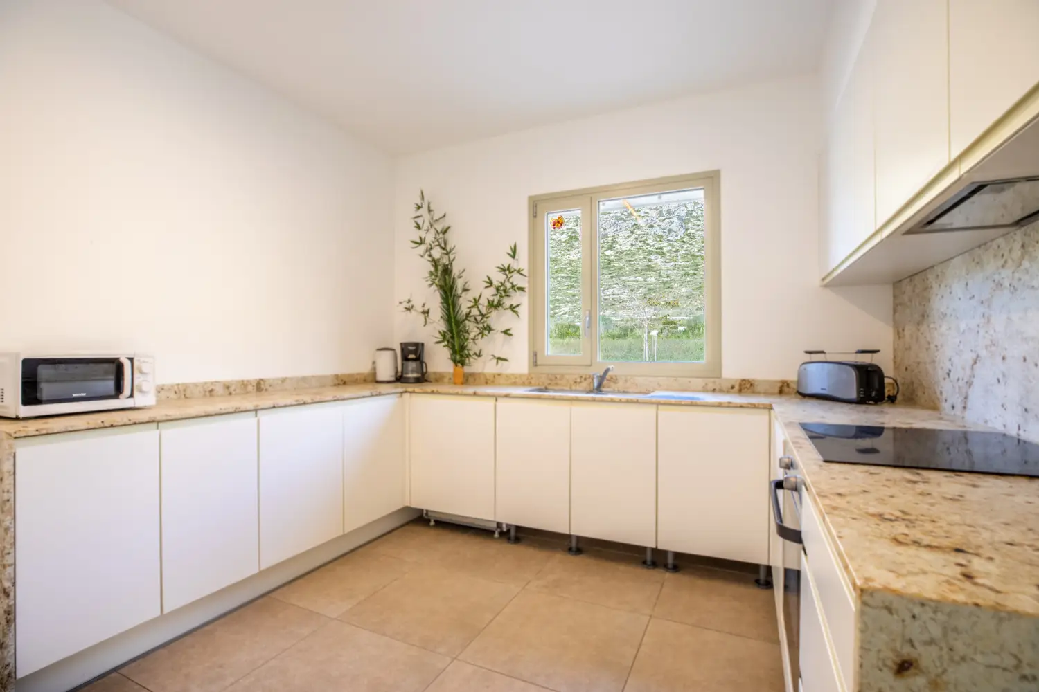 Step inside and feel instantly at home. The ground floor boasts a vast open-plan living and dining area where sunlight pours through floor-to-ceiling windows, opening straight onto the terrace and pool. A fully equipped kitchen makes cooking a pleasure, while two en-suite bedrooms (one double, one twin) provide convenience and comfort.